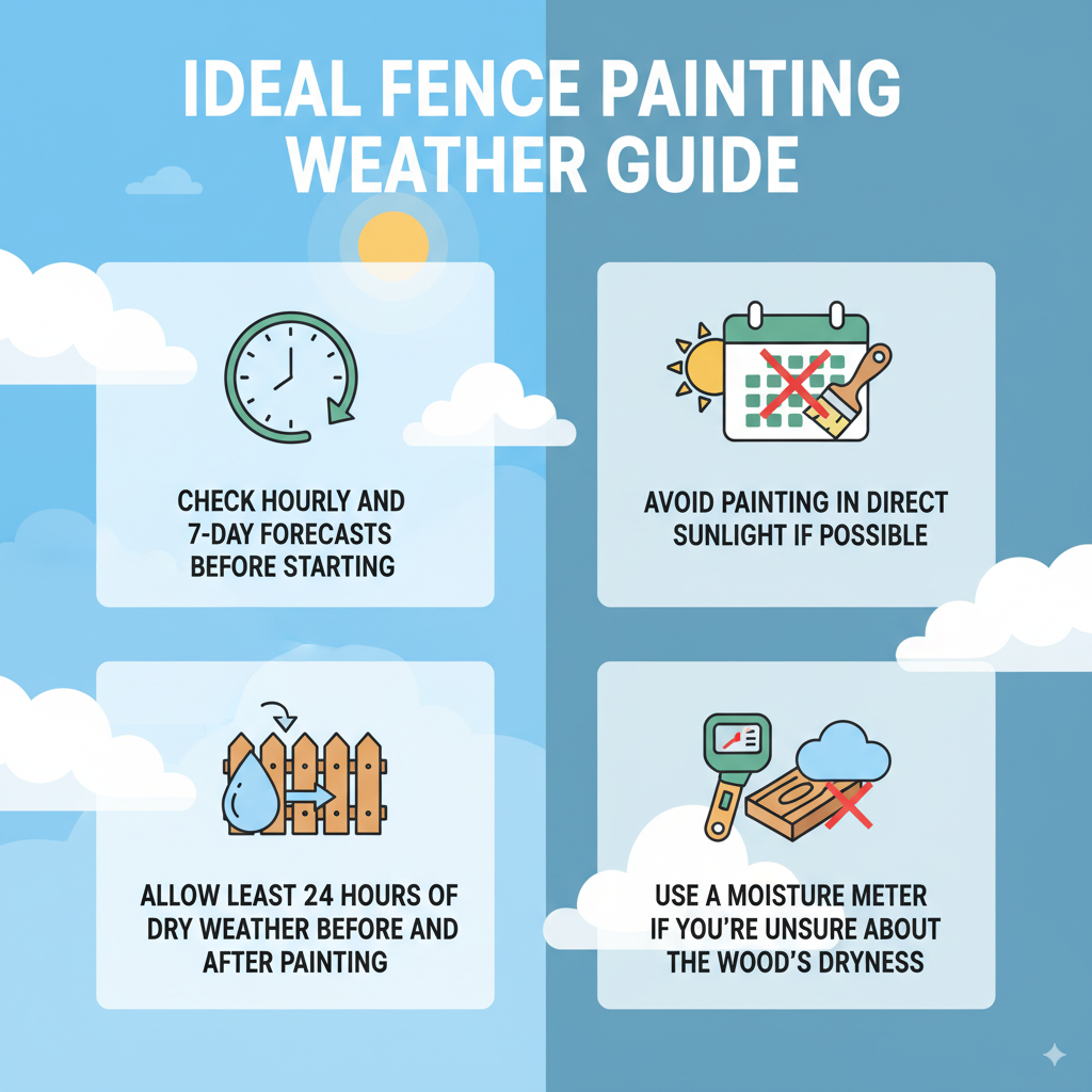 Painting a fence seems simple, but weather can make or break your results. If itโs too cold, the paint wonโt dry correctly. If itโs too hot, it can dry too fast, leading to cracking or bubbling. And if rain is in the forecast, you might be washing your efforts away within hours.